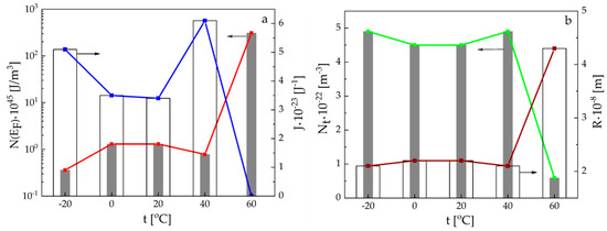Figure 16 shows the temperature dependence of the real component of the complex impedance measured perpendicularly to layers for the hierarchical GaSe(SC(NH2)2(SmCl3)) structure. The anomalous increase of ReZ with temperature is observed in the temperature range 0–20 °C. To clarify the nature of such an effect, the temperature dependence of the density of states at the Fermi level N(EF), hopping radius R, trapping centres scattering J, and the density of the deep trapping centres are presented in Figure 17. The critical temperature point T = 20 °C represents the minimal distribution in trapping centres at a relatively low value of the density of states at the Fermi level. One must mention that a considerable impact on the carriers’ mobility perpendicularly to the nanolayers has scattering mechanisms being temperature-dependent.