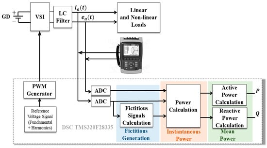 When calculating the power in a system, just as it is done in measuring equipment, it is necessary to calculate the power in programmable electronic devices to perform calculations of apparent, active, reactive power and power factor. Various applications require this calculation; for example, for the exchange of power with the electrical grid [], it is necessary to calculate the active and reactive power from the measurement of current and voltage to control the distribution of power in electric microgrids using the droop control technique []. In [], a power calculation method is proposed for the improved UPS system that shows better current-sharing performance, taking the inductor current instead of the output current.