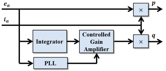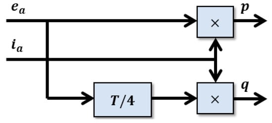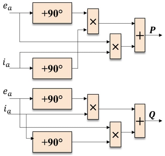 This method, proposed in [], uses orthogonal signal generators for voltage and current. The method seeks to avoid the use of a low-pass filter so that the calculation of active and reactive power is faster when the droop control of active and reactive power distribution is performed in microgrids. In this method, the authors propose a novel way of calculating the active and reactive power in an easy way and with a high system response time. The use of the low-pass filter needed for power measurement in conventional methods in the abc reference frame is eliminated and the process is performed using only 90° phase shifts, multiplications, and additions. Figure 6 [], shows the original schemes proposed for the active and reactive power calculation.