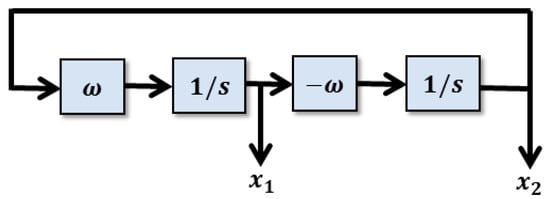 The observer design proposed follows the idea in [], which starts from a single-phase sinusoidal oscillator as shown in Figure 5. The desired steady-state solution from the oscillator is given by and , where is the frequency of oscillator in rad/sec and x1, x2 are the state variables.