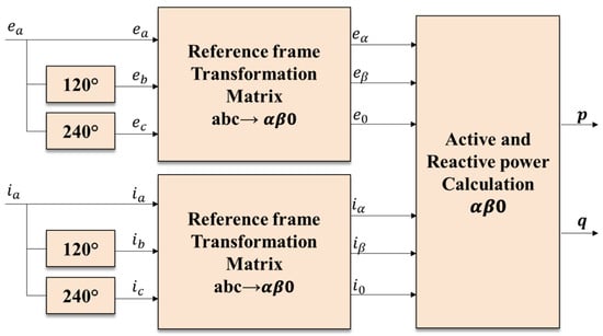 Another method for calculating the active and reactive power can be carried out from the stationary reference frame employing the power invariant Clarke transformation, commonly known as method αβ0 []. As shown in Figure 7, it is necessary that the transformation matrices from the natural reference frame to the reference frame αβ0 have all the inputs enabled. In other words, it is necessary that the voltage and current signals of the single-phase system are connected directly to the inputs “a” of the reference frame converter blocks. Additionally, it is also essential that the other inputs, “b” and “c”, respectively, have the same inputs but with a phase shift of 120° for the former and 240° for the latter.