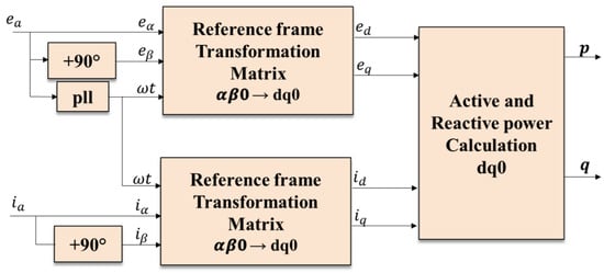The calculation of active and reactive power in a single-phase system under the rotating reference frame has the advantage of delivering an almost constant value of active and reactive power as it is a rotating reference frame, commonly called the dq0 method []. As shown in Figure 8, an additional element is required to constantly calculate the rotation angle, such as a PLL. Since a single-phase system is used, the sample signals are taken and connected to the input “α” of the transformation blocks from the reference frame αβ0 to the reference frame dq0, in order to carry out the measurement correctly. At the same time, the original sample signals are taken, and a 90° delay is applied to them and then connected to the “β” inputs of the same transformation modules. The idea is to take the signals in the abc reference frame but as if they were working in the αβ0 reference frame with a 90° phase difference between the signals.