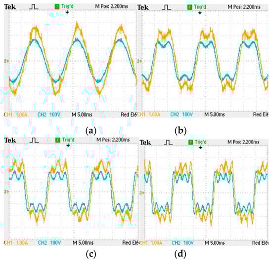 Analytical calculations are performed according to the definitions present in the IEEE 1459-2010 standard []. As mentioned in the introduction of this section, Figure 9 shows the current and voltage waveforms obtained for the RL series load under 4 different operation conditions. Each one of those 4 waveform sets were obtained by setting the VSI voltage reference to synthesize waveforms with different harmonic content. The experiments performed are as follows: (1) Only the fundamental component, (2) fundamental and 3rd harmonic, (3) fundamental, 3rd and 5th harmonic, 4) fundamental, 3rd, 5th and 7th harmonic.