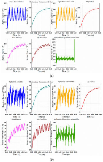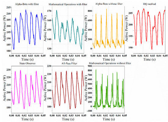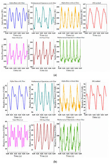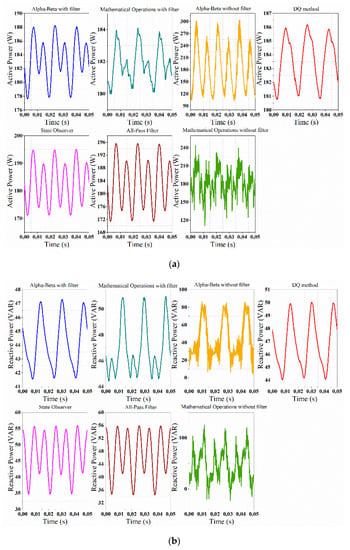 Regarding the performance of methods in the presence of harmonics in the RL test load, the mathematical operations method was the one presenting a greater deviation of active power, whereas the opposite happened with the reactive power. However, due to the large amplitudes of oscillations presented in the mathematical operations method, this is therefore not suitable for rapid control strategies that require little variation. Taking this into account, the all-pass filter, the State Observer, and DQ methods are the most accurate, with an error of 16% for active power. Nonetheless, for reactive power, the αβ and the DQ methods are the ones that obtained the best performance.