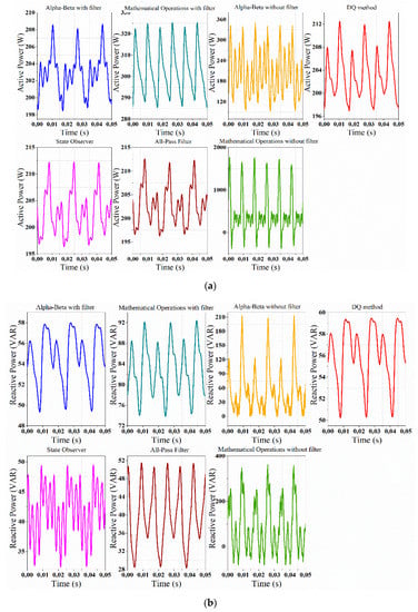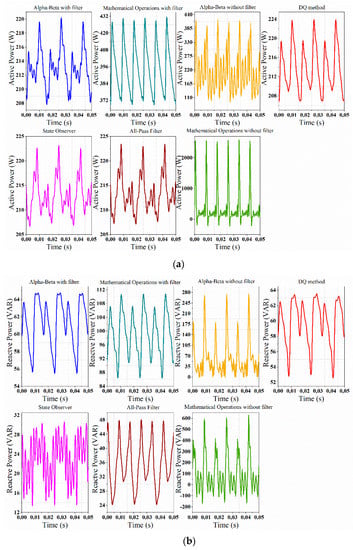 The mathematical operations method exposes the highest percentages of error in active power: 17.766% when it does not have the filter and 18.072% when it does. The highest percentage of error for reactive power is presented by the all-pass filter method, with 51.657%. The DQ and State Observer methods retain good behavior in terms of the amplitude of oscillations and regularity of error in a steady state for both, active and reactive power. In the active power, the lowest error is shown by the αβ method, whereas the lowest error for the reactive power is given by the mathematical operations method with filter. Figure 13 shows the active and reactive power for the system with a third harmonic plus fifth harmonic component.