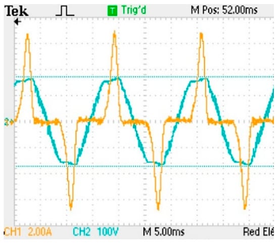 Waveforms of the current and voltage in oscilloscope for the non-linear load.