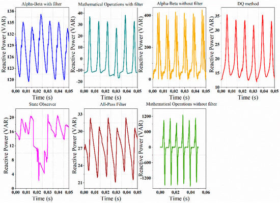 In Figure 14, taking into account that the system presents harmonic content comprising the third, fifth and seventh harmonics, it is verified that the mathematical operations method presents high peaks of active and reactive power in a very short time as the number of harmonics increases, as shown in Table 2. In the same sense, the αβ method allows it but with less amplitude.