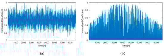 (a) Load annual fluctuation coefficient; (b) photovoltaic annual fluctuation coefficient.