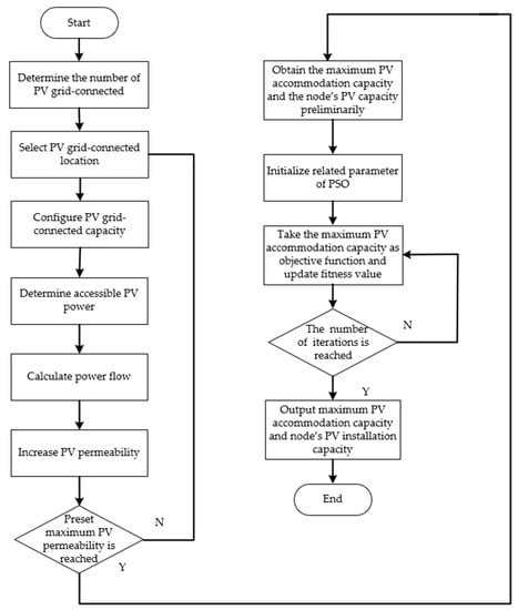 First, Monte Carlo is used to preliminarily obtain the maximum PV accommodation capacity and the PV capacity configuration of each node. Then, the PV capacity of each node is used as a reference to optimize initial value of PSO for the optimal solution. The process of evaluating PV accommodation capacity of a distribution network with the PSO–Monte Carlo algorithm is shown in Figure 2. The specific steps are as follows: