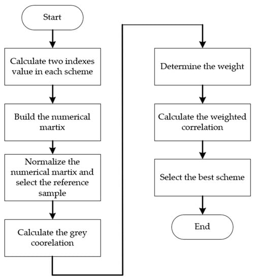 For the four indicators of the above schemes, how to choose the most suitable scheme not only needs to take into account the correlation between the indexes and the ranking of the importance between the indexes, but it also needs to consider the data changes of different schemes within the indexes. Therefore, the correct choice of a better plan requires a combination of subjective and objective ways to choose a reasonable plan. AHP is a combination of quantitative methods and qualitative methods, using the experience of decision makers to judge the relative importance of the standards that measure whether the goals are achieved, and giving a reasonable weight for each standard of each decision-making plan. GRA is a multi-factor statistical analysis method, which is based on the sample data of each factor and uses the grey correlation degree to describe the strength, size and order of the relationship between the factors. That is, AHP focuses more on subjective experience, weights of which are used to find the important order of index, while GRA focuses more on the numerical relationship of data factors. In this paper, GRA is used to analyze the degree of correlation between the values in different indexes. AHP is used to determine the importance of different indexes according to subjective judgement. The specific evaluation process with AHP and GRA is as follows: