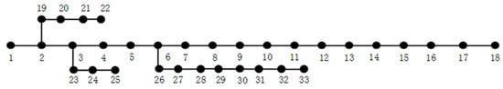 This example uses MATLAB2019a for the simulation. The operating system is a 64-bit Windows 10 system, the RAM is 4.0 GB, the CPU is Intel Core I7-5500U, 2.4 GHz, and the core frequency is 3.0 GHz. This example uses the IEEE 33 system, which is shown in Figure 5. The reference voltage of the system is 12.66 kV. The base power of the system is 10 MVA. Node 1 is the balanced node whose voltage is 1.04 pu, and the total system load is 3.72 MW + j2.30 Mvar. The PV output system and load fluctuation coefficient are shown in Figure 1 above, and the ambient temperature is taken as 25 °C. The inverter limit power factor is set to 0.95. To ensure that the inverter has sufficient reactive power regulation capacity, the inverter capacity is set to 1.1 times higher than the PV installation capacity. The unit period for optimized scheduling is 1 h, and the total period for optimized scheduling is 1 year.