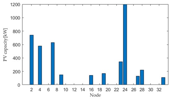 According to the distribution of the node PV capacity in Figure 6, the capacity of some nodes is almost 0, the PV installation capacity of some nodes is less than 100 kW, and the capacity of some nodes is higher than 100 kW. It is worth noting that the boundary of this simulation is only a simulation of the scene with the largest installation capacity.