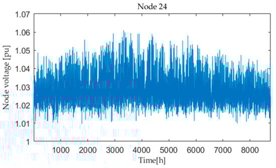 It is assumed that when the planned PV capacity of the distribution network reaches 6 MW, the original node PV access capacity increases in proportion. According to the annual PV factor and the load factor, the annual voltage timing simulation is carried out. Since node 24 is installed with the largest PV capacity, the node voltage limit is also the most serious, as shown in Figure 7. Therefore, it is necessary to use the staged control strategy of the inverter and energy storage to restore the node to the specified value in order to ensure the safety and stability of the distribution network.