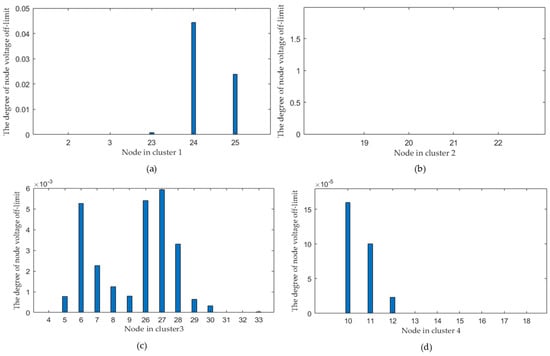 This paper divides the standard distribution network into four clusters through the principle of electrical distance and power balance under configuring the node PV capacity. The degree to which the voltage exceeds the limit for each node in each cluster is shown in Figure 8.