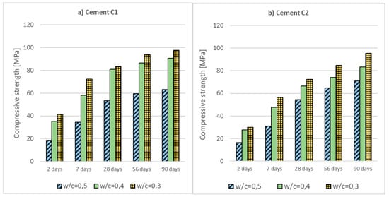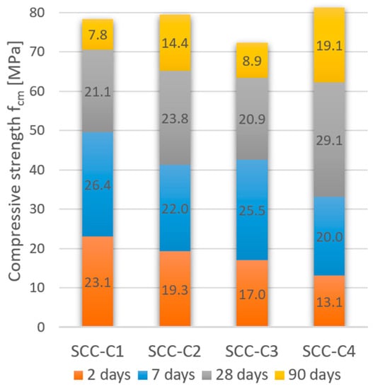Concretes produced with low-emission C2–C4 cements in the amount of 300 kg/m3, after 90 days of curing, achieved compressive strength fcm 50 MPa (Figure 5), which corresponded to the compressive strength class C35/45 (required standard strength in exposure class XC4 is C 25/30 []).