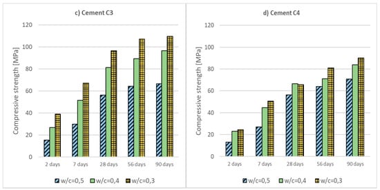 Compressive strength of cements with different w/c ratio: (a) Cement C1; (b) Cement C2; (c) Cement C3; (d) Cement C4.