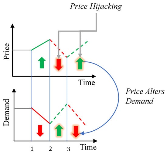 Feedback effect between price and DSM demand. As prices go up, demand decreases. However, if prices are hijacked and false prices are fed to DSM systems, then a false low price increases demand, and a false high price can decrease demand. The same is true if demand was altered by an attack. If load usage is increased by an attacker, then prices would increase and vice versa.