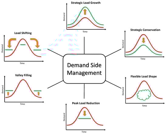 DSM is an active and voluntary approach for reducing electricity use through activities or programs that promote electric energy efficiency, conservation, or more efficient management of electric energy loads [6]. Very often, ISO’s utilize financial incentives and educational programs to modify consumer demand. The main goals of DSM are peak clipping, valley filling, load shifting, strategic load growth, flexible load shaping, and strategic conservation. We summarize these goals in Figure 2. In these goals, consumers are encouraged to use less energy during peak hours, or to move the time of energy use to off-peak times such as nighttime, or reduce overall consumption. Other applications for DSM are to aid grid operators in balancing intermittent generation from wind and solar farms due to their volatile nature, which may not coincide with energy demand at different times.