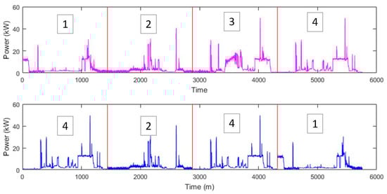 Process of block bootstrap simulation of a new home power usage (bottom) from a template home (top). Example simulation samples are taken from four days from the template series with replacement.
