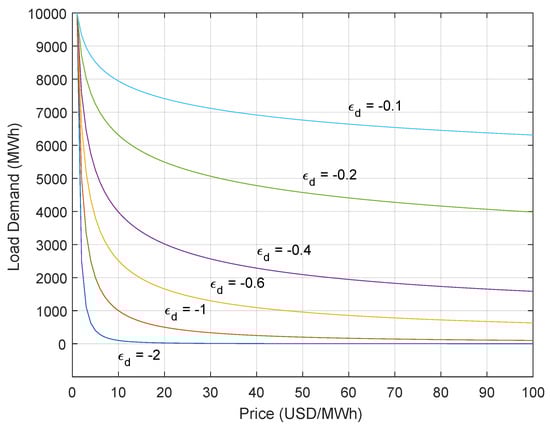 where a is a scaling constant. An example demand curve estimated from Equation (3) can be seen in Figure 4. The figure also showcases the nonlinear relationship between load and price where as the price, the independent variable, increases, the load demanded, the dependent variable, decreases.