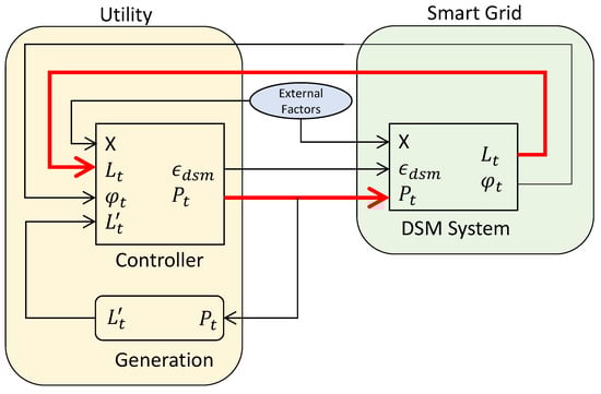 In our approach, if the aggregate load is above the target load, RTP is set higher to decrease demand. If the aggregate load is lower than the target load, the price decreases to increase demand. Thus, as also can be observed in Equation (8), there is direct feedback between price and load Equation (4). The block diagram in Figure 5 also outlines this feedback that showcases the relationship between the utility and the grid. Generation sets the target load based on the price and supply of power, and the controller sets the price signal and the elasticity of demand coefficient for DSM systems. The price is then communicated into the grid into DSM systems, which adjust load usage appropriately. The bold red lines in Figure 5 highlight the feedback relationship between price and demand. The scope of work is in the mathematical modeling of the controller and DSM system relationship. With such a model, we present in the next section how attackers can exploit it.
