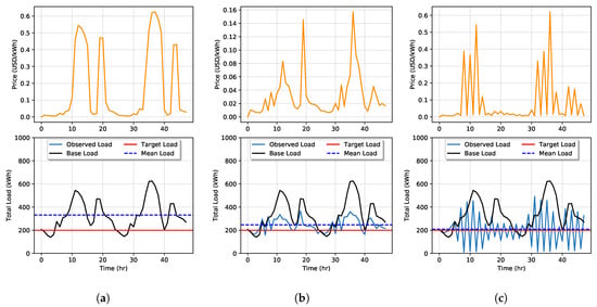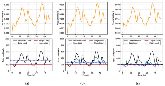 Next, we rerun the simulation setting . In the Goal 1 scenario in Figure 6b, we see that the base load was reduced with a mean observed load of 269 kWh. In Figure 7b, the same simulation is run with Goal 2. Here, the mean observed load was further reduced to 246 kWh, but large price spikes occur at peak load times. Finally, we run simulations for to study the effects of high penetration of DSM. In simulating both goals, shown in Figure 6c and Figure 7c, the mean observed load is reduced to 208 kWh, which is very close to the target load. However, in Goal 2, we see great resonating feedback effects occur when prices spike very high. RTP increases as a response to large values in the observed load. Then, when the load decreases to low levels, a price decrease causes the load to spike more during the next time step, while under Goal 1, this is not observed. The higher prices set in Goal 2 would see a large cost to DSM participating customers.