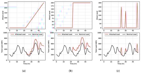 There are different goals an attacker can have to harm the power grid or exploit it. For example, an attacker can cause chaotic metering by messing the metering data transmission, efficiency loss of the energy provided by causing higher load volatility, or the energy system failure by overloading the power lines or devices. The focus of this work is efficiency loss by increasing user loads through direct load manipulation. In this scenario, we introduce three possible types of load attacks: ramp, sudden, and point attacks. These types of attacks are visualized in Figure 8 wherein plot (a) an attacker gradually increases a user’s load over time. In plot (b), an attacker suddenly ramps up the power usage to a specified level, and, in plot (c), we demonstrate a point attack where the attacker increases loads only for specific hours.