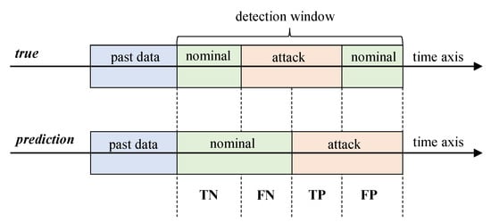 For the security of cyber DSM systems, the major concern is not just the detection of attacks, but also the detection of nominal data with high reliability. We want a detection system that can predict not only with high accuracy but also with high precision and recall to avoid false alarms. Therefore, we measure the True Positives (TP), the True Negatives (TN), the False Positives (FP), and the False Negatives (FN). Definitions of these measures are visually shown in Figure 9. We use these measures to calculate several main performance indicators of accuracy, precision, and recall.