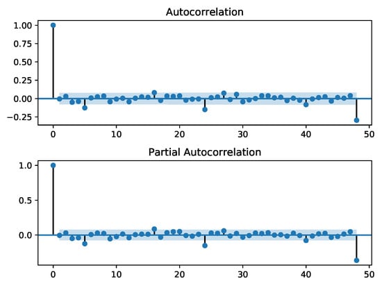 where B is the back-shift operator of the model, , , , and are fixed coefficients determined by the model after capturing the behavior of the series. is the price or load data at time and is the residual of the data. The exponents in the equation represent the times that the back-shift operator is multiplied.