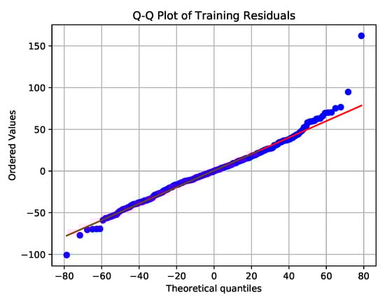 To ensure the residuals are white noise, we apply the Augmented Dickey–Fuller (ADF) test to check for stationarity, and we examine the ACF/PACF plots to check for independence and run a Jarque–Bera test, and we examine a Q-Q plot to check if the residual series has a Gaussian probability distribution. We conduct these checks on all scenario training datasets, where we first train a SARIMA fit on them and then subtract that fit to produce the residual series. In all the training data sets, the residuals were stationary from the ADF test and independent from ACF/PACF plots. However, the Jarque–Bera test and Q-Q plots showed that the observations did not come from a Gaussian distribution. Example, ACF/PACF, and Q-Q plots for are shown in Figure 10 and Figure 11. Despite the residuals not being Gaussian, we still run the sequential detectors and examine their performance.