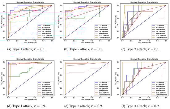 Experimental results from the six scenarios are reported in Table 2, in the form of accuracy, recall, and precision metrics, and Figure 12 which showcases six ROC curves, one for each scenario. All performance measures in Table 2 were calculated using the best thresholds found in the ROC curves by searching for the shortest distance from each curve to the corner (0,1). As seen in Figure 12c,f type 3 attacks, under any DSM level, had the lowest detection rates across thresholds with ANN being the worst performer. In Figure 12a,d, LR yielded the best performance with GNB, and again ANN being the worst. Type 2 attacks in Figure 12b,e resulted in the best detection with CUSUM, LR, GNB, and GBC having perfect performance.