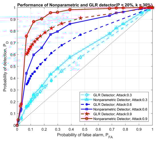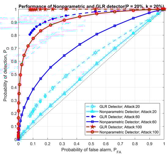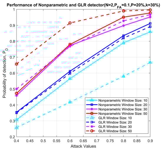 Figure 15 plots the performance comparison as a function of attack magnitude and window sizes for a fixed false alarm probability (). As expected, the GLRT outperforms the nonparametric detector for larger window sizes regardless of attack magnitude. With smaller window sizes and, consequently, shorter delay in detection, the nonparametric detector outperforms the GLRT, which illustrates that, when statistical variations are small (due to fewer users, smaller attack magnitude or lower delay), nonparametric detectors are appropriate.