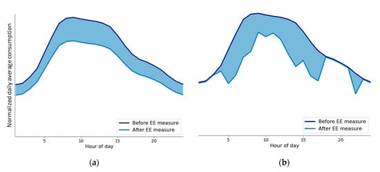 Illustration of normalized load shape pre- and post-investment with similar shape based on commercial efficient lighting example (a) and normalized load pre- and post-investment with different shape based on commercial lighting occupancy sensors example (b) from data accompanying [].