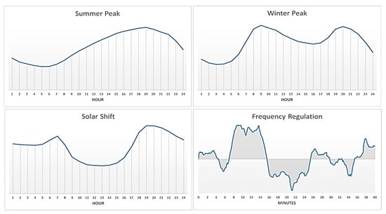 Illustrative system prototypes representing Summer peak shed (ISO-NE weekday average load in August 2018), Winter peak shed (Northwest weekday average load in February 2018), Solar shift (CAISO net load on 5 March 2018), and Frequency regulation (PJM RegD normalized signal). The Summer and Winter Peak prototypes illustrate the normalized hourly demand curve of the system; the Solar Shift system prototypes illustrate normalized hourly net load on the system; and the Frequency Regulation illustrates normalized fast frequency response needed both in the positive and negative direction over a period of 40 min [,,].