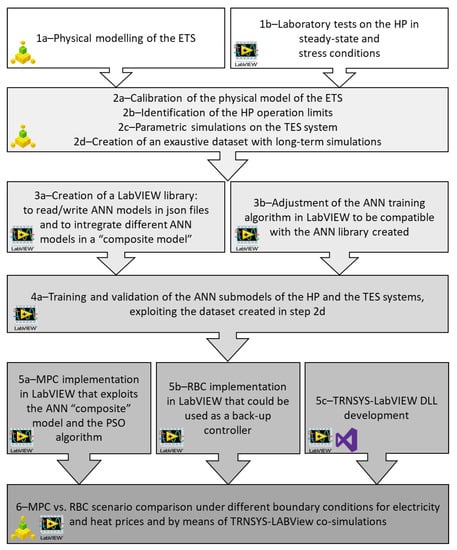 - D’Ettorre, F.; Conti, P.; Schito, E.; Testi, D. Model predictive control of a hybrid heat pump system and impact of the prediction horizon on cost-saving potential and optimal storage capacity. Appl. Therm. Eng. 2019, 148, 524–535. [Google Scholar] [CrossRef]