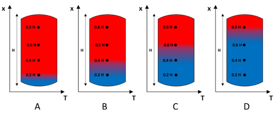 - four values for the relative height of the sensor used to control the thermal energy storage temperature, as shown in Figure 7, and identified with a letter (A = 20%, B = 40%, C = 60%, and D = 80%);
