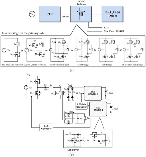A conventional front-end AC–DC power supply unit for an LCD TV is shown in Figure 1a. In addition, this illustrates the circuit for implementing the primary side inverter of the DC-DC stage. It has three outputs: an LED voltage to power the backlight; 12.8 V for the audio/T-con; and 5 V to power the system. The Vdrv line powers the LED driver stage on the panel, then boosts the voltage to a string voltage to drive the three stages (PFC + DC/DC + B/L) of the power system that are needed to drive the lamps, further reducing the AC-to-backlight efficiency. Two additional stages of the power system are required to drive the LED strings: a non-isolated DC–DC boost stage to build up to the LED string voltage, and an LED-dimming current controller to regulate the string current. This can adversely affect the overall system efficiency.