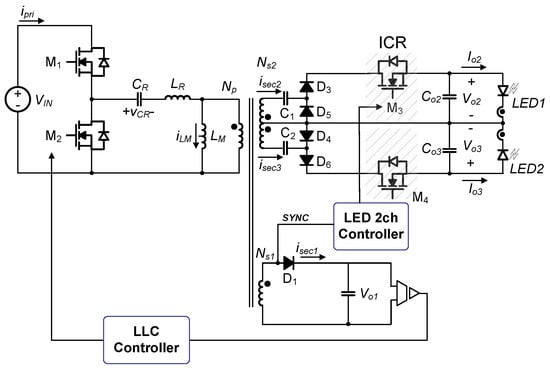 Figure 1 shows a schematic of a conventional multi-output LED driving circuit [4]. The resonant converter controls only one master output, and the slave output is not controllable. To manage this issue, a conventional LED application requires an additional power regulator, e.g., a buck converter or boost converter. However, adding the post-regulator results in increased power dissipation and cost.