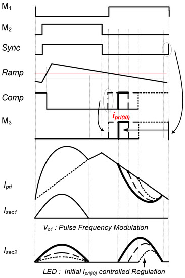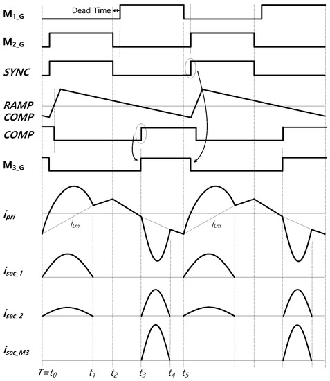 Furthermore, when M2 is conducting, the difference between ipri and iLM1 is transferred to the output side as isec1. Similarly, when M1 is conducting, the difference between ipri and iLM2 is transferred to the output side as isec2. From Equations (2), (6), and (7), isec1 during t0–t1 and isec2 during t3–t4 can be obtained as follows: