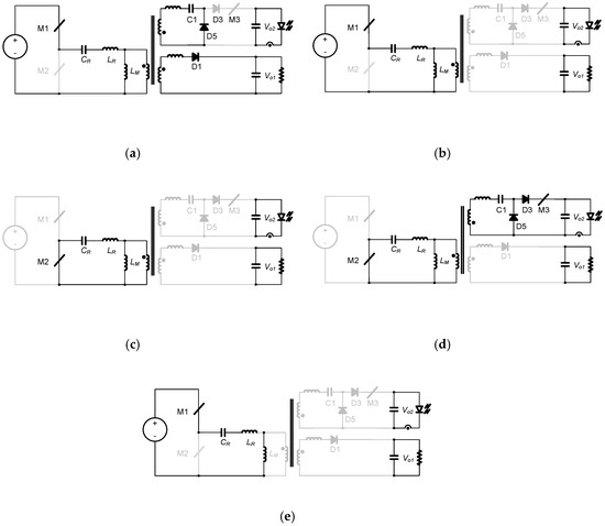 Operation modes of the proposed converter: (a) Mode 1; (b) Mode 2; (c) Mode 3; (d) Mode 4; and (e) Mode 5.