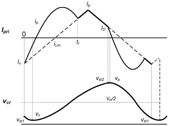 Waveforms of resonant current ipri(t) and voltage vCR(t) for steady state.