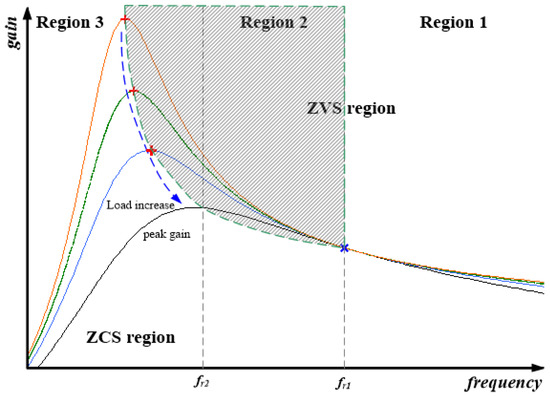 In Figure 7, Region 1 is the SRC operation region. The converter operates in this region when the switching frequency is higher than fr1. The magnetizing inductance does not participate in the resonance, and a ZVS condition is naturally assured. Region 2 is the multi-resonant converter region. The load condition between fr1 and fr2 determines the operation of the converter under ZVS and zero current switching (ZCS) conditions.