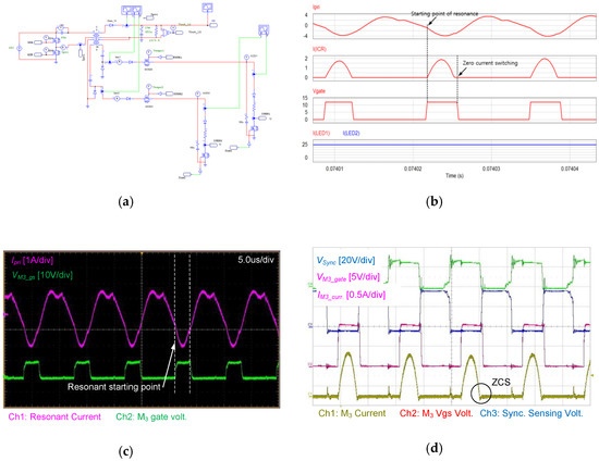 Computer simulation and experimental waveform of M3: (a) PSIM simulation circuit; (b) PSIM simulation graph; (c) resonance current on primary side converted to output side; and (d) zero current switching (ZCS) operating waveforms of the proposed converter.