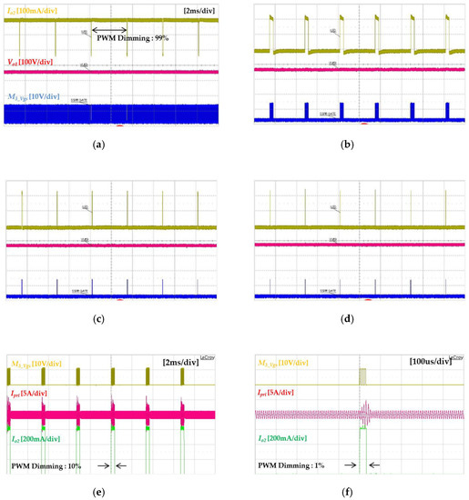 Experimental waveforms according to LED 2D/3D dimming: (a) 2D pulse width modulation (PWM) dimming: 99%; (b) 2D PWM dimming: 10%; (c) 2D PWM dimming: 1%; (d) 2D PWM dimming: 0.2%; (e) 3D PWM dimming: 10%; and (f) 3D PWM dimming: 1%.