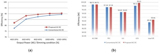 Based on Table 1, Figure 12 shows the total efficiency of the power system from AC to the final LED backlight (AC EMI + PFC + DC/DC + LED backlight driver) and the efficiency of each stage is also compared. Efficiency measurements are efficiency data according to LED dimming conditions as shown in Figure 11. This is a measure of operating from dark to full brightness on a TV screen. Assuming that the components not specified in Figure 12 have similar power consumptions, the proposed driver shows a lower consumption by approximately 1.74 W power loss than the conventional driver.