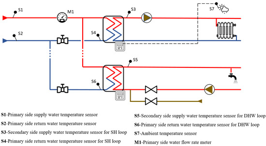 Heating substations are instantaneous heat exchanger systems connected to the DH network as the heat source for buildings. The substations consist of a primary side, i.e., the DH grid, and a secondary side, i.e., heating systems in buildings. Figure 1 shows a schematic view of a typical configuration of the DH substation. There are at least two loops on the secondary side, i.e., one or more than one loops for space heating (SH), depending on the building size, one loop for domestic hot water (DHW) preparation, and in some buildings, one or more loops for ventilation systems. All 61 substations are equipped with smart control systems, which target the secondary side supply water temperature as the control output by adjusting the water flow rate on the secondary side, according to a predefined weather compensation curve (WCC). The supply water temperature on the primary side is controlled by the utility, based on the regional heat demand and the weather of the day. It usually ranges from 60–110 °C during the year. In Greater Copenhagen, the DH supplies heat for DHW preparation all year round and for SH in heating seasons, which is usually from mid-September to mid-May of the next year (ca. 242 days). All the meters installed in the substation are smart meters, from which real-time data are recorded, with an hourly interval on both the primary side and the secondary side. The data can be accessed via the data management systems for the utility and the municipality.