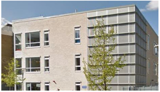 A daycare center ( = 10 h, = 13.5%) was selected for load shifting modeling. The building has three floors and a total heated floor area of approx. 900 m2. It was constructed in 2005 and uses radiation system supplies by the district heating network. The material of the wall is brick, and the roof is covered by roofing felt. The exterior view of the building is shown in Figure 3. The secondary side of the substation consists of two SH loops and one DHW loop. The modeling of the DH substation was carried out in Modelica using a Dymola programming environment. The component models were selected from the LBL Buildings Libraries [44] and Modelica standards.