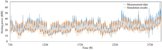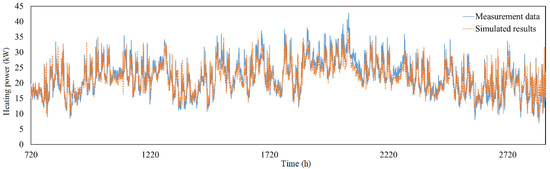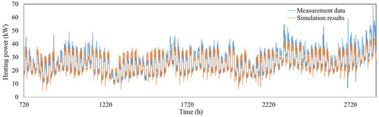 For the validation of the model, 5-month measured data from November 2017 to March 2018 were used. Figure 6 shows a 3-month comparison between the measured and simulated heat consumption from December 2017 to February 2018. The CV(RMSD) value in Table 4 indicates that the model can reproduce the actual energy consumption profile with a decent level of confidence.