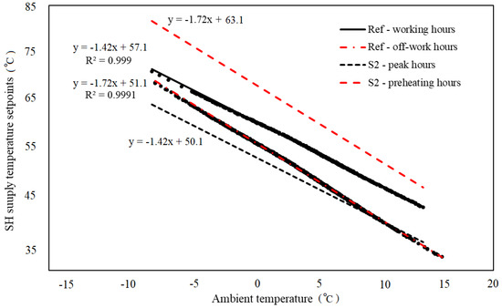 Scenario 1 (S1) was designed to reduce the morning (06:00–9:00) setpoints, while keeping the setpoints the same as the reference case during other hours. It utilized the night setback, which has already been implemented in the original control strategy. In S2 and S3, the setpoint was lowered during the morning peak hours (06:00–09:00), by reducing the intercept by 7 °C compared to the reference scenario. The variation between S2 and S3 was the preheating duration, as the preheating began at 04:00 for S2 and 03:00 for S3. The supply water temperature setpoints were higher in S2 than S3, to ensure the room temperature within a comparable range. Figure 7 shows the WCCs of S2 as an example. In all scenarios, during the period outside the preheating hours and peak hours, the setpoints were kept identical to the reference ones.