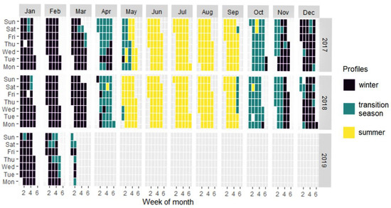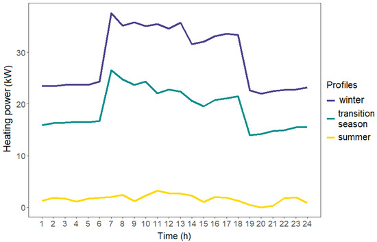 For every building, the daily heating profiles were clustered into three clusters, which show distinct seasonality. As examples, the clustering result of the case study building is shown in Figure 8. For each cluster, a representative profile curve was formed by applying the median on the daily heating demand profiles in this cluster. Figure 9 presents three representative profiles of the three clusters, which are the median profiles of individual clusters. It is better to use median values than mode or mean values, because the underlying distribution is not normal [47]. Winter profile contained the coldest months of the year, with the highest heating power and an apparent variation between daytime and nighttime; in the cluster of the transition season, the heating power was much lower, and the variation between daytime and nighttime was not as noticeable as in winter. With the DHW demand as the only heat demand in the summer, the heating load was the lowest and flattest.
